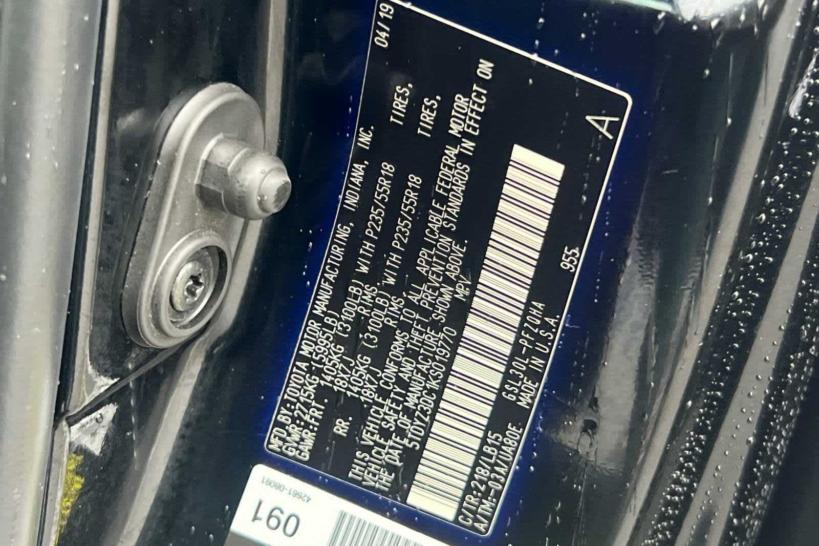 - VIN : 5TDYZ3DC1KS019770