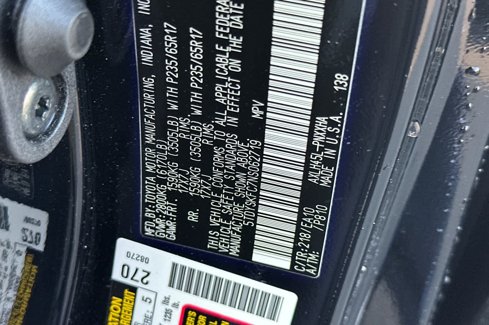 - VIN : 5TDYSKFC7NS062719