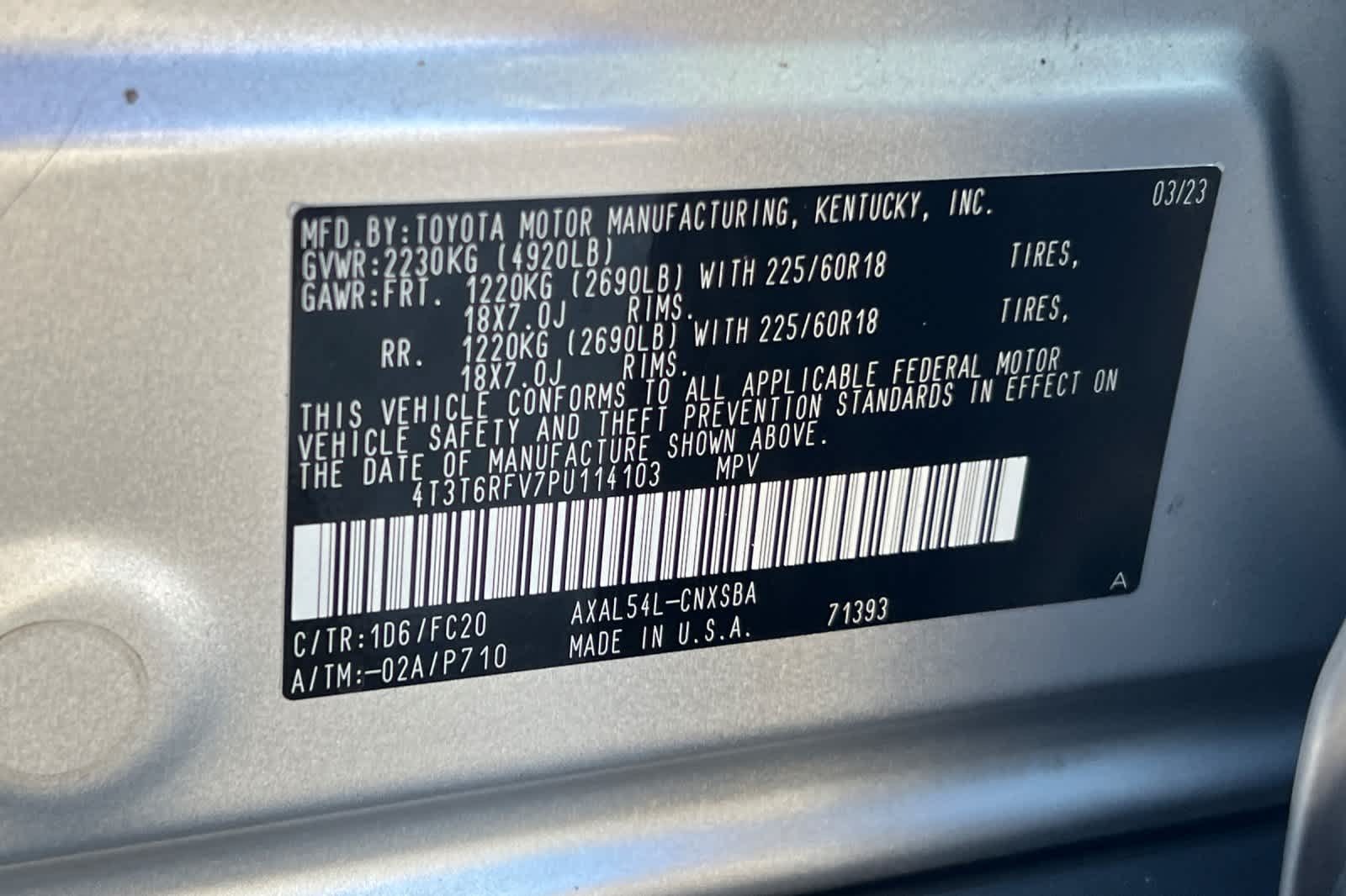 - VIN : 4T3T6RFV7PU114103