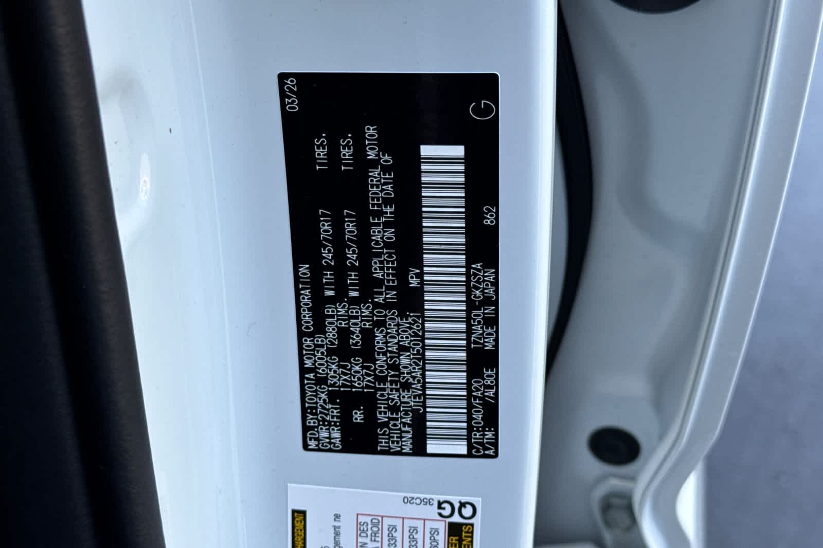 - VIN : JTEVA5AR2T5012621
