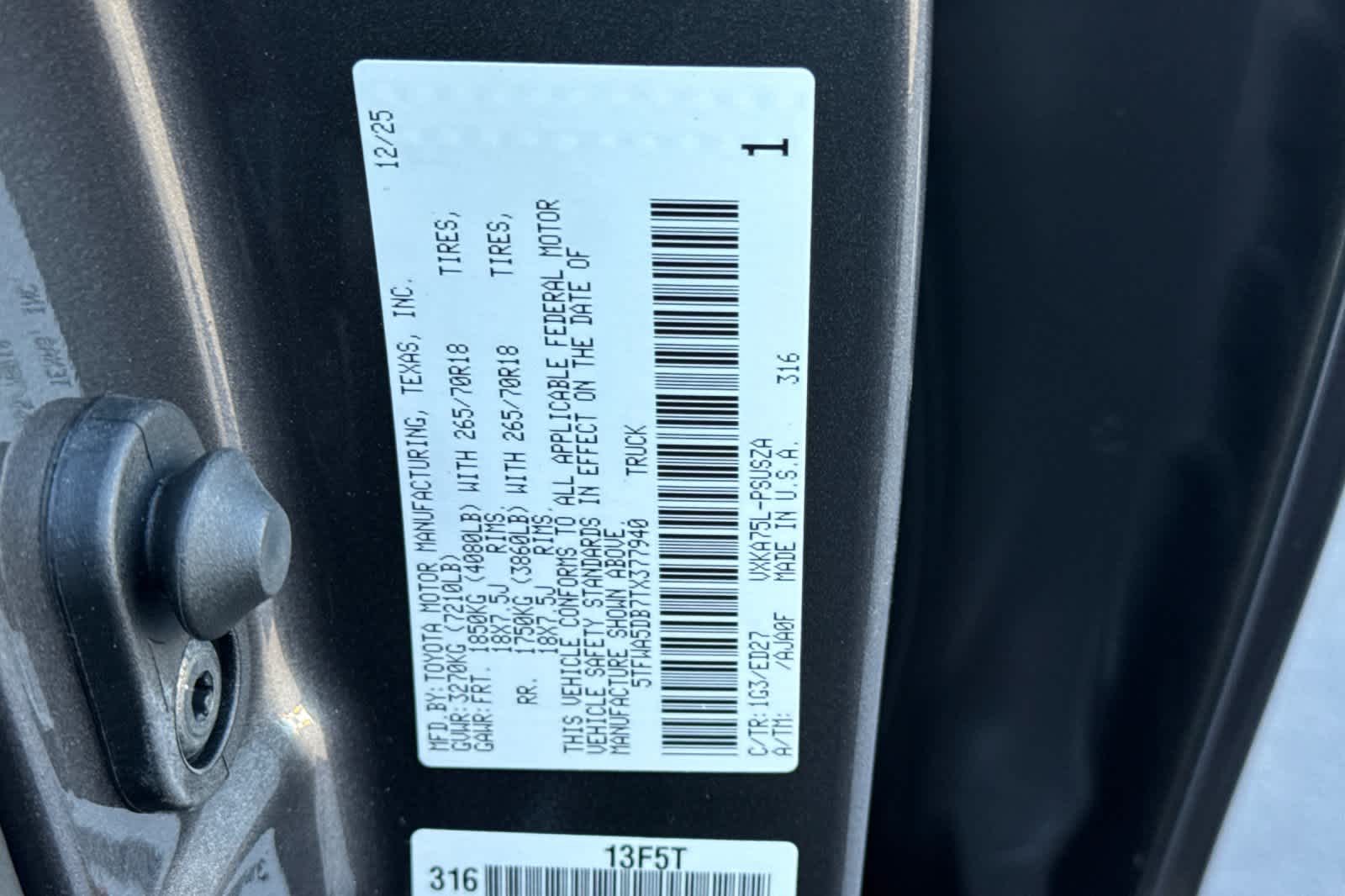 - VIN : 5TFWA5DB7TX377940