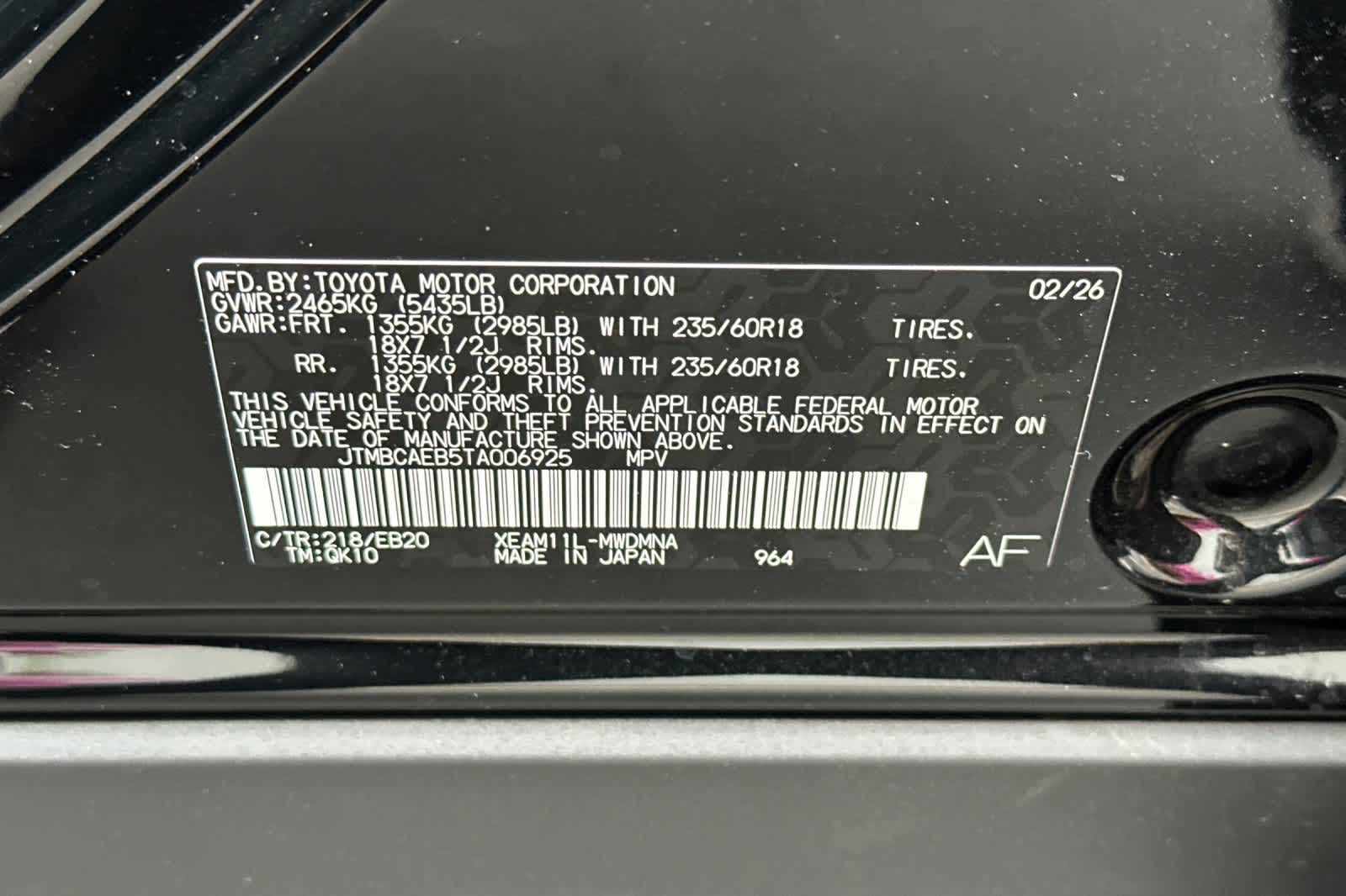 - VIN : JTMBCAEB5TA006925