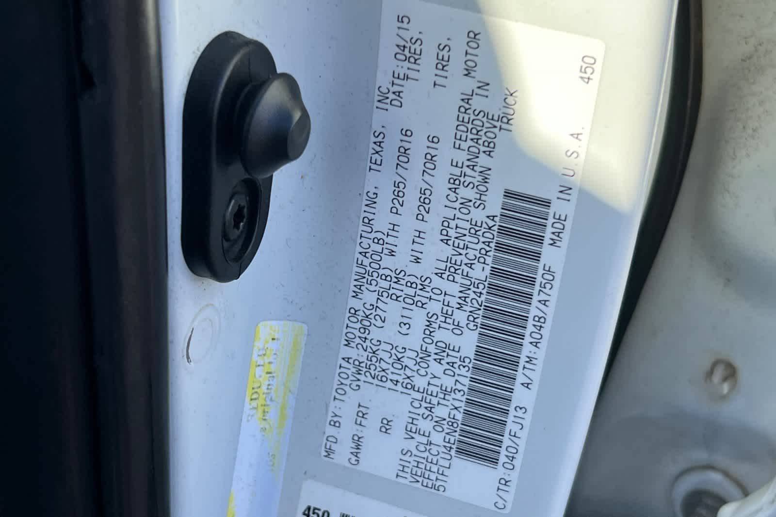 - VIN : 5TFLU4EN8FX137135