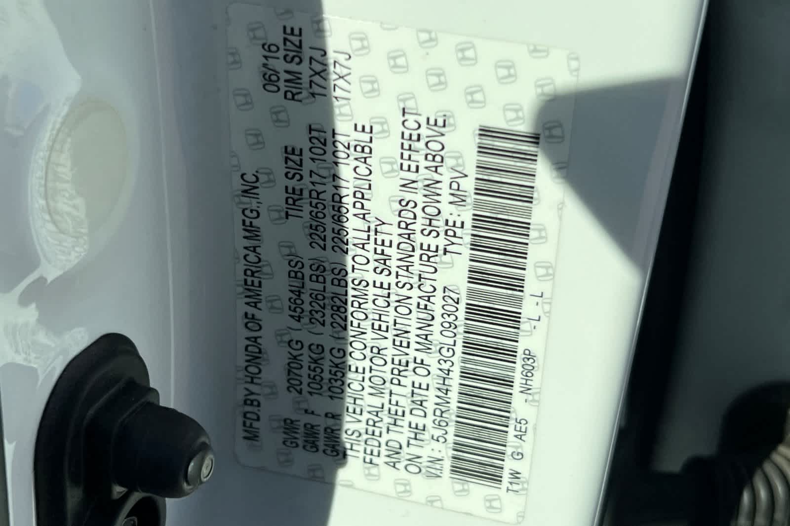 - VIN : 5J6RM4H43GL093027