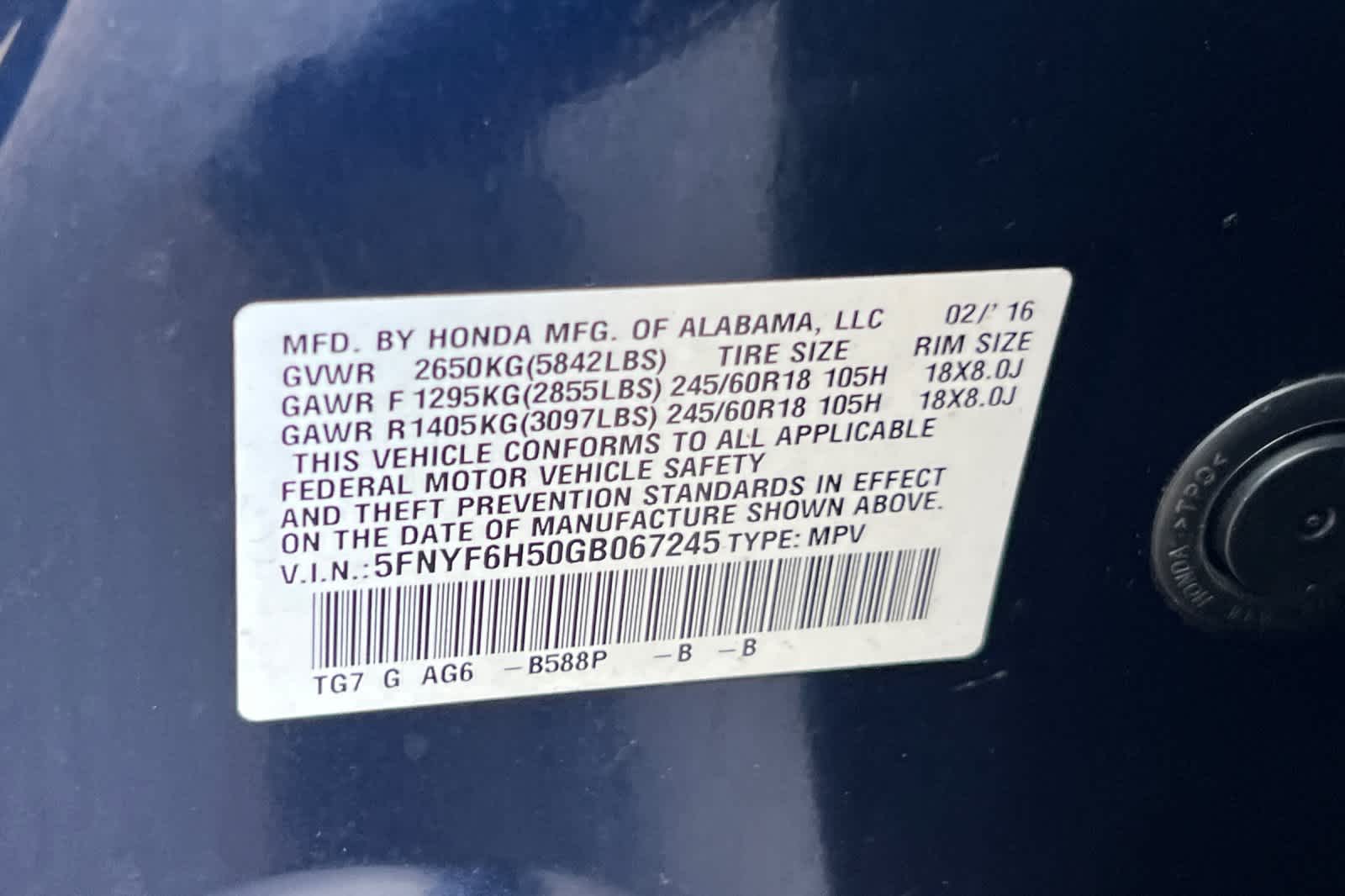 - VIN : 5FNYF6H50GB067245