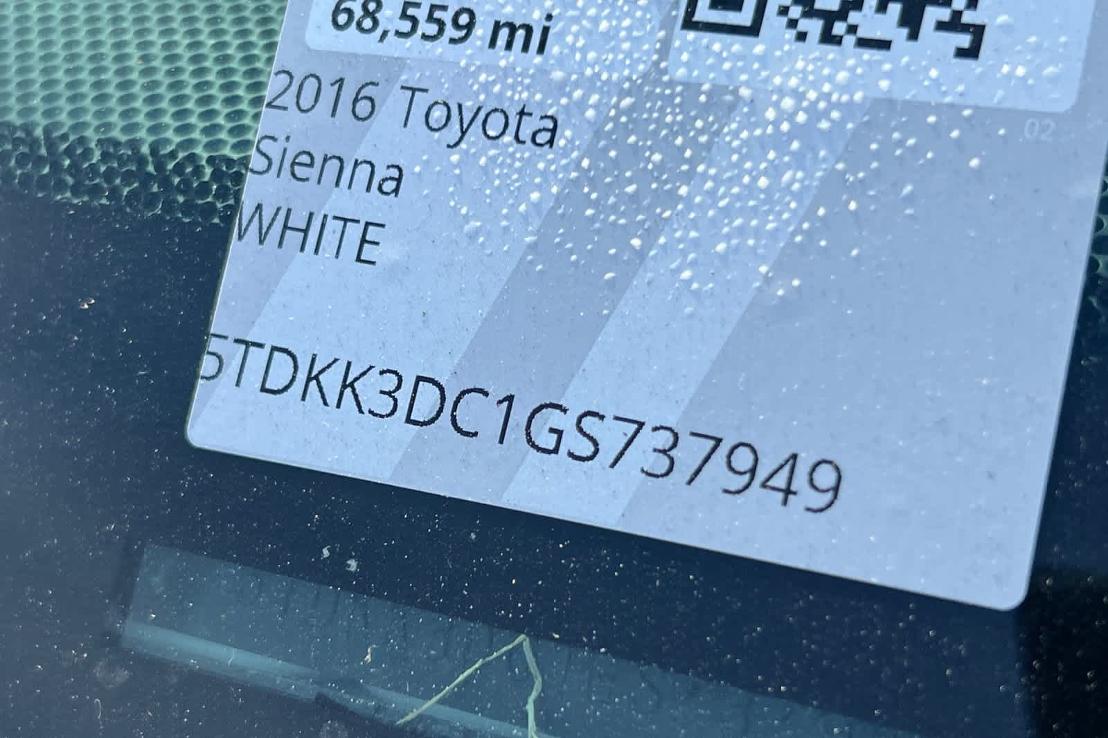 White 2016 Toyota Sienna LE 7 Passenger FWD 6-Speed Automatic Electronic with Overdrive 3.5L V6 SMPI DOHC 17 x 6.5 5-Spoke Alloy Wheels, ABS brakes, Alloy wheels, Bumpers: body-color, Compass, Electronic Stability Control, Front dual zone A/C, Heated door mirrors, Illuminated entry, Low tire pressure warning, Power door mirrors, Remote keyless entry, Roof rack: rails only, Spoiler, Traction control.