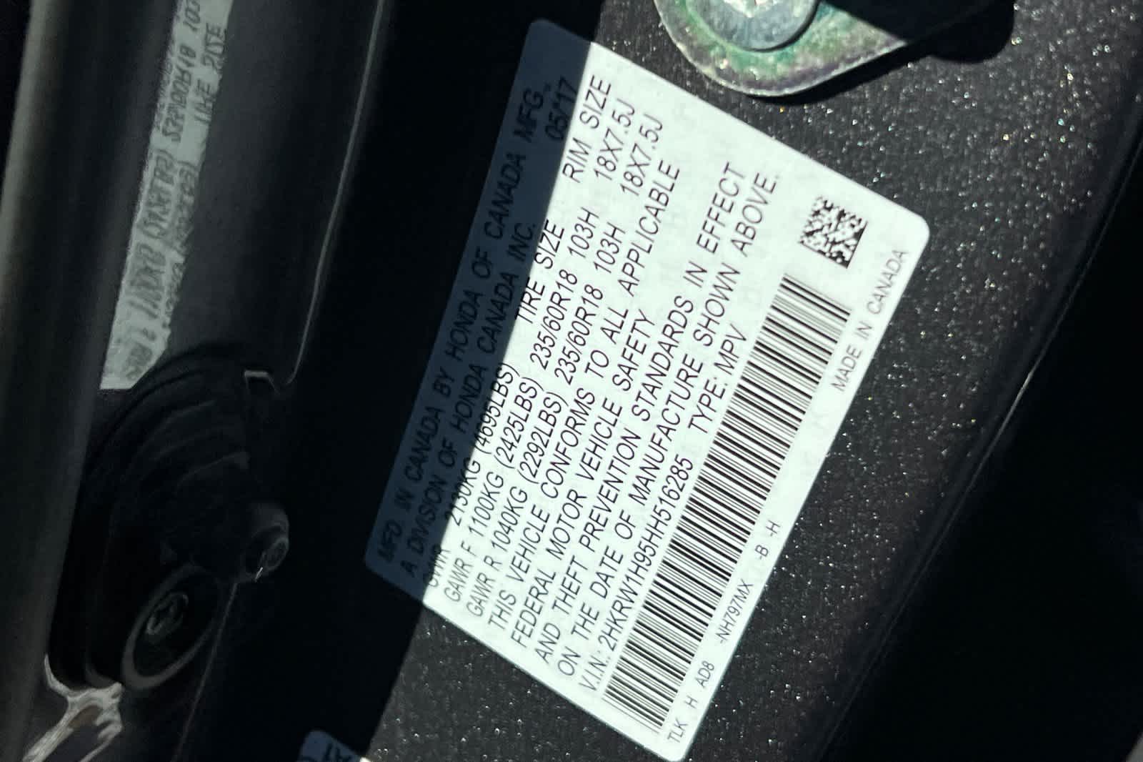 - VIN : 2HKRW1H95HH516285