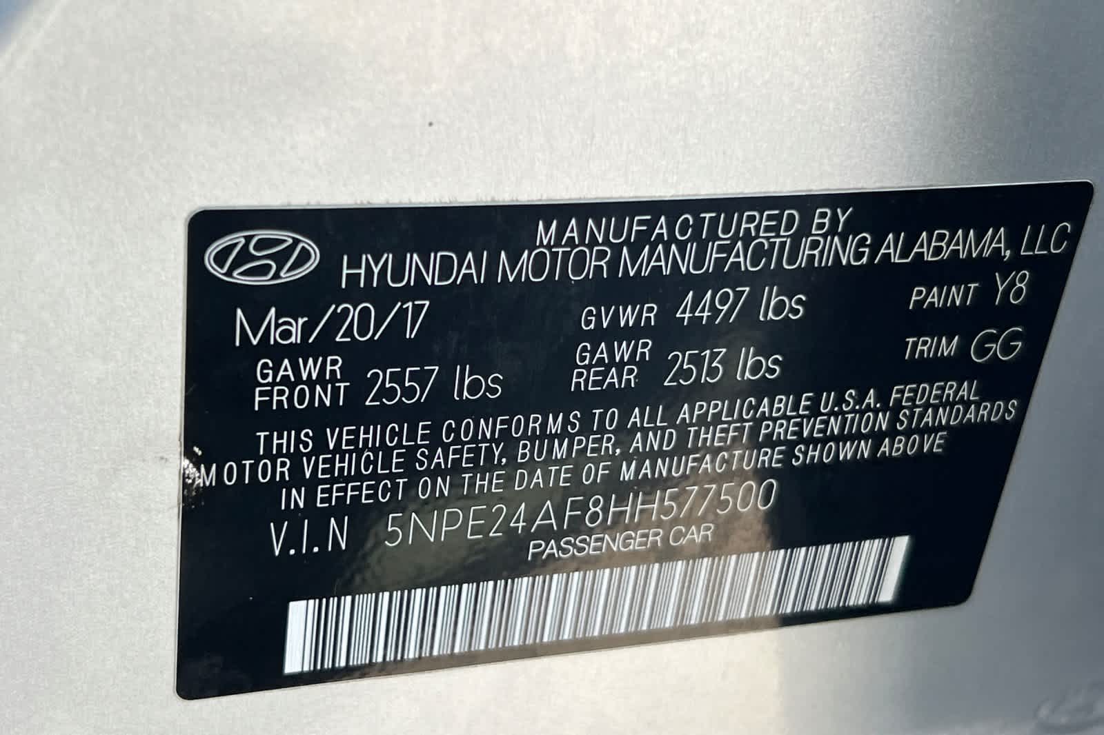 - VIN : 5NPE24AF8HH577500
