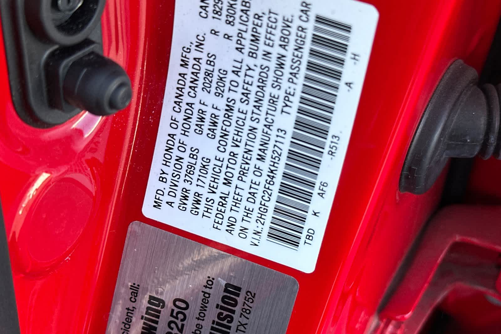 - VIN : 2HGFC2F64KH527113