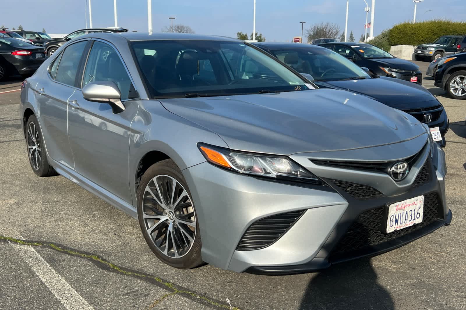 Silver 2019 Toyota Camry SE FWD 8-Speed Automatic 2.5L I4 DOHC 16V Cloth, ABS brakes, Active Cruise Control, Alloy wheels, Electronic Stability Control, Illuminated entry, Low tire pressure warning, Navigation System, Remote keyless entry, Traction control.