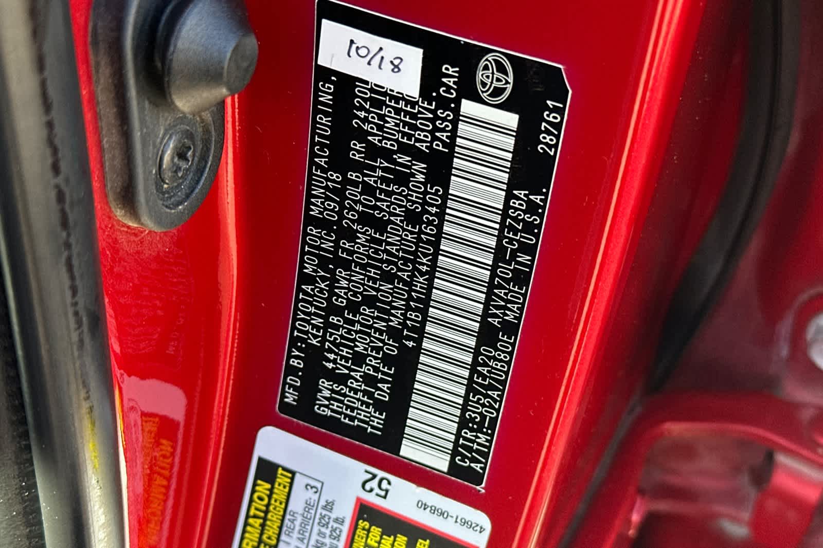 - VIN : 4T1B11HK4KU163405