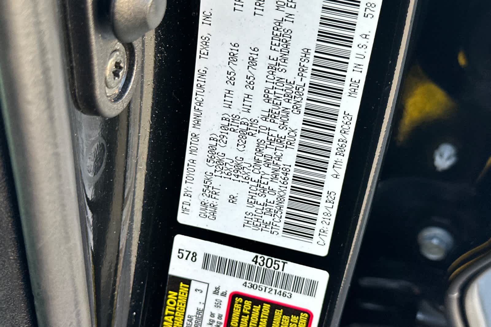 - VIN : 5TFCZ5AN8KX166481