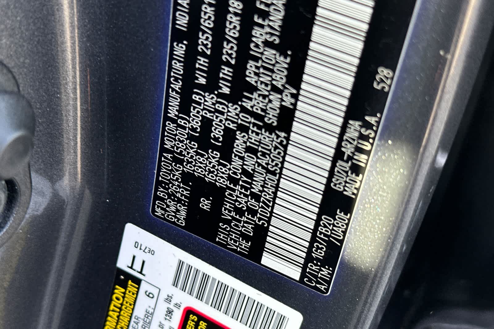 - VIN : 5TDZZRAH0LS505754