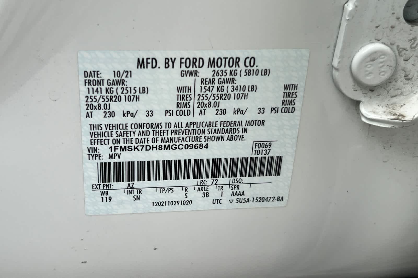 - VIN : 1FMSK7DH8MGC09684