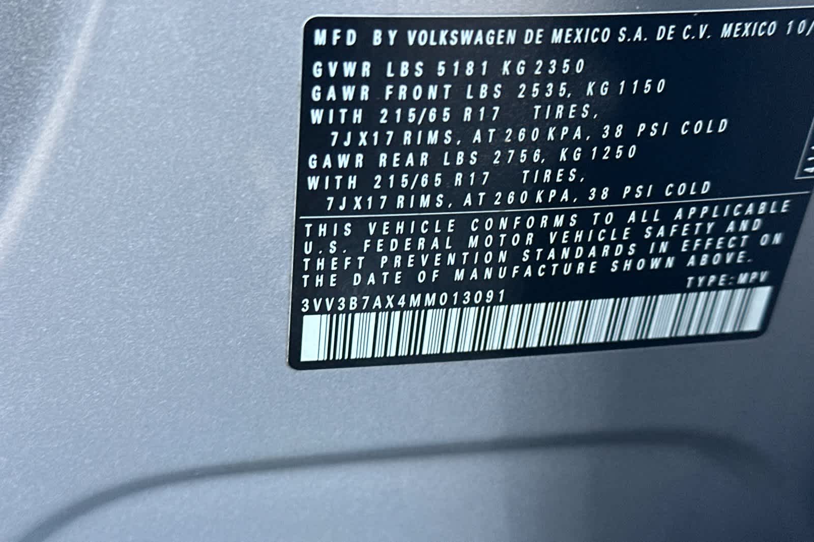 - VIN : 3VV3B7AX4MM013091