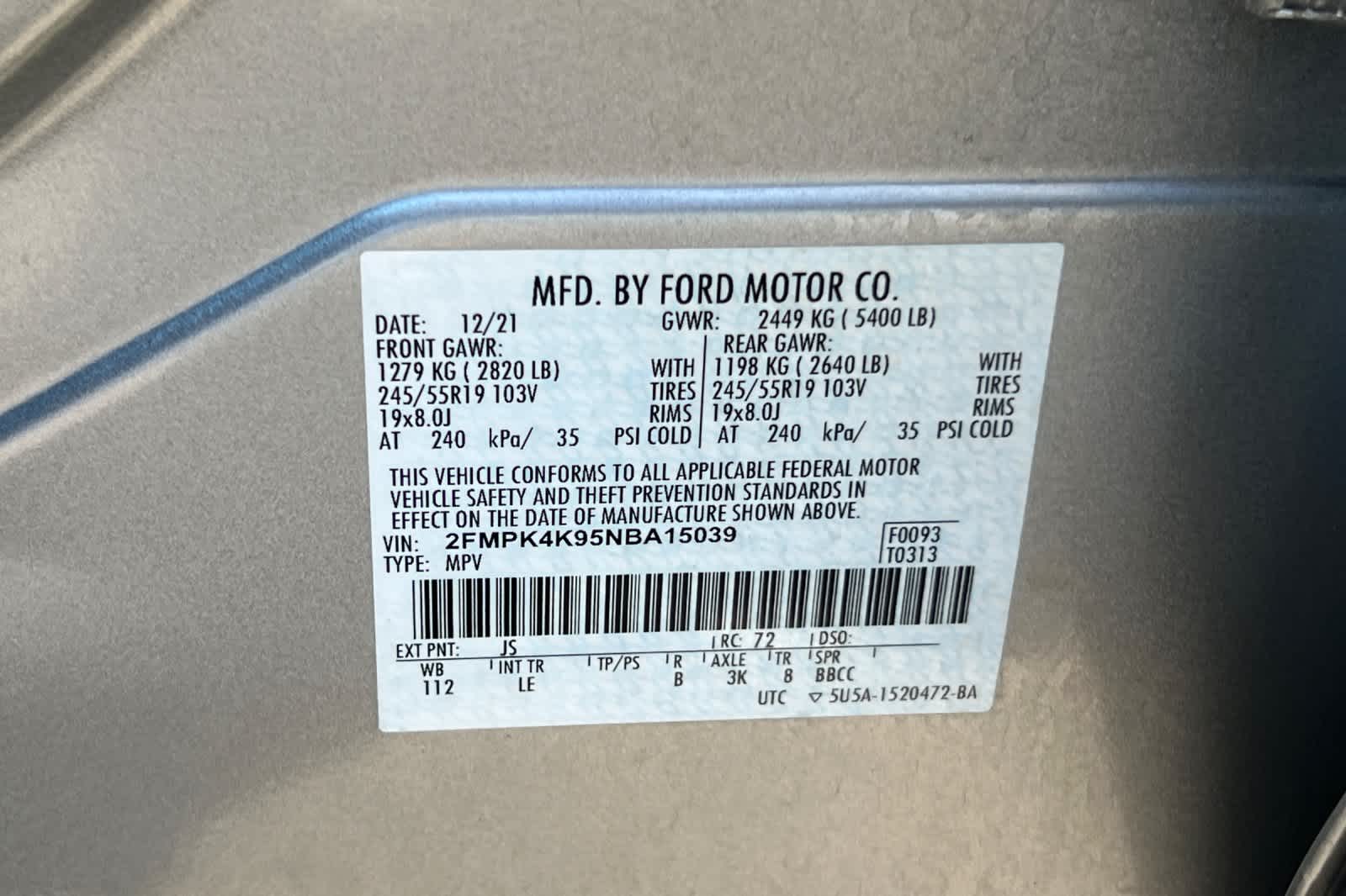 - VIN : 2FMPK4K95NBA15039