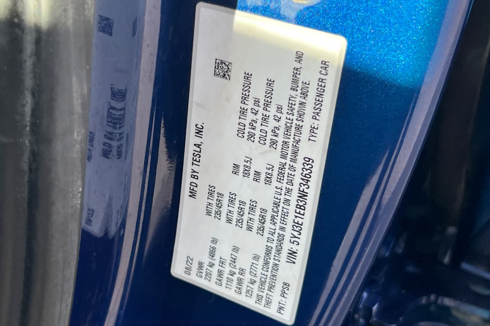 - VIN : 5YJ3E1EB3NF346339