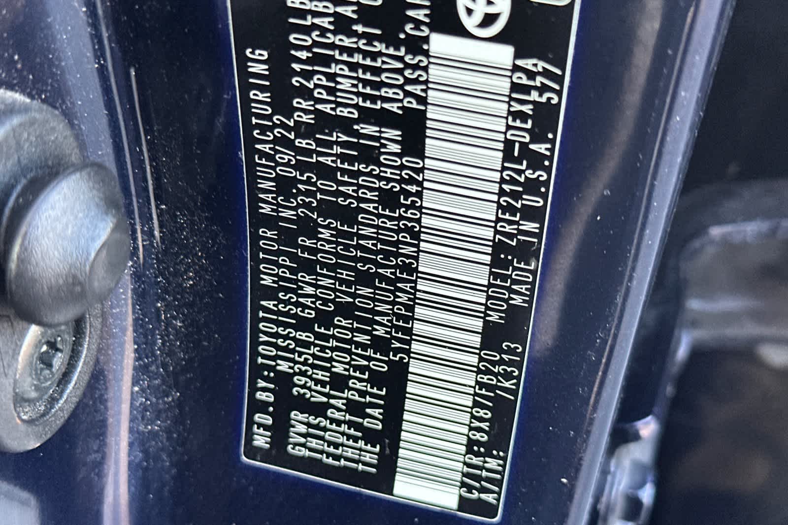 - VIN : 5YFEPMAE3NP365420