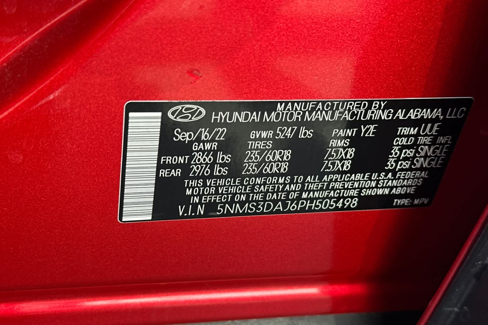 - VIN : 5NMS3DAJ6PH505498