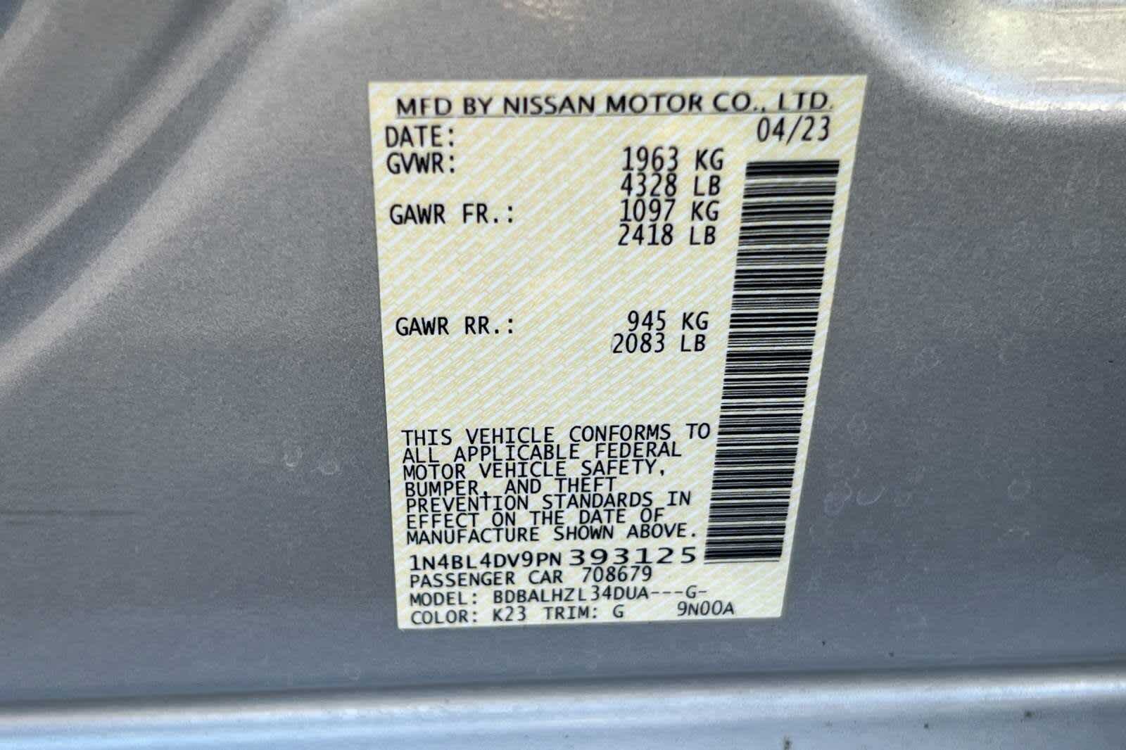 - VIN : 1N4BL4DV9PN393125
