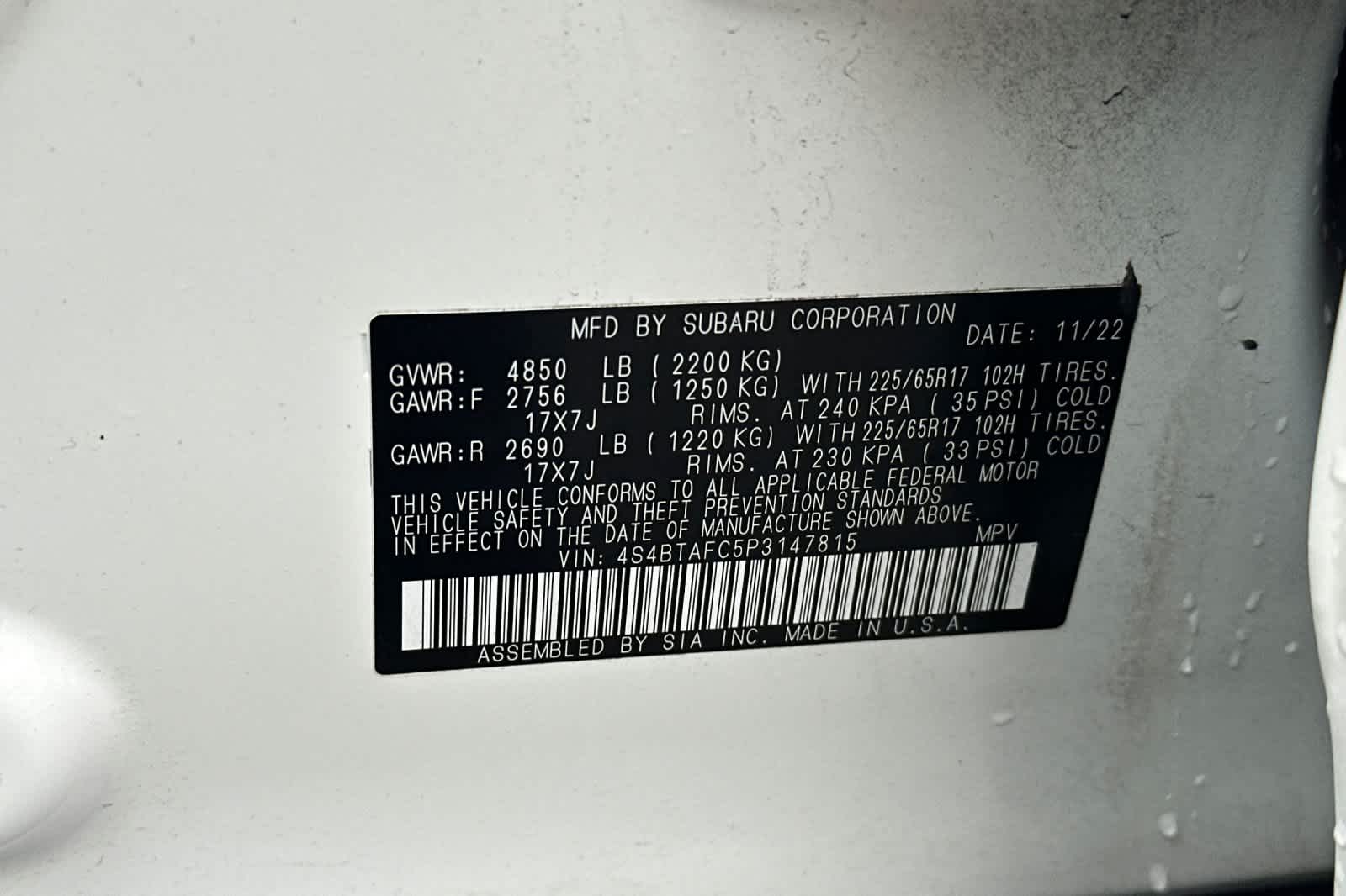 - VIN : 4S4BTAFC5P3147815