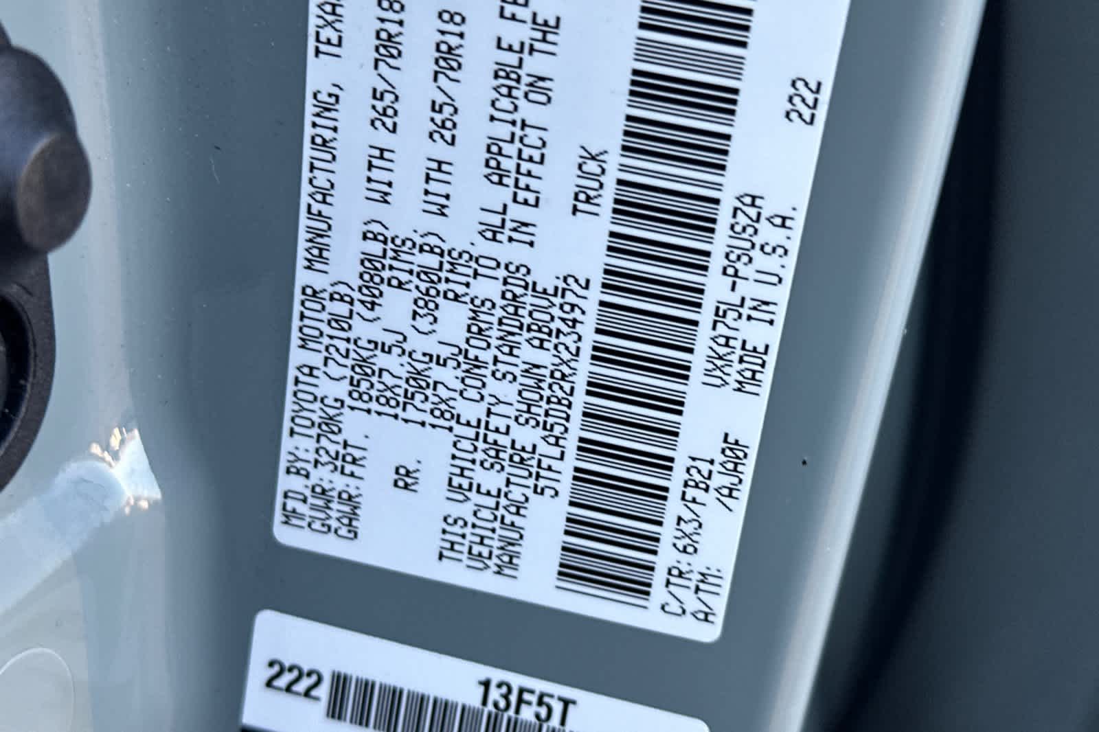 - VIN : 5TFLA5DB2RX234972